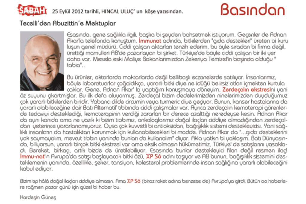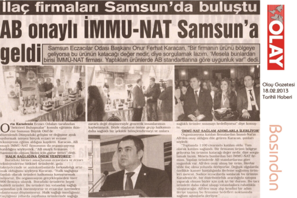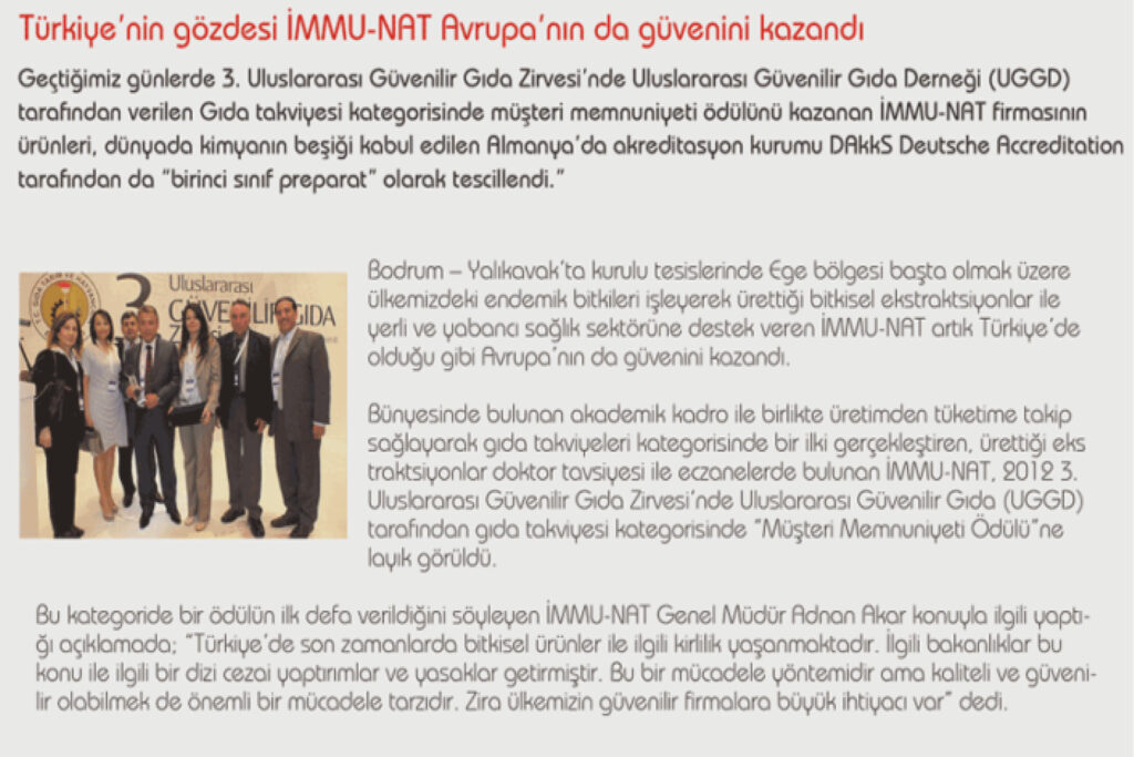 Geçtiğimiz günlerde 3.Uluslararası Güvenilir Gıda Zirvesi’nde Uluslararası Güvenilir Gıda Derneği (UGGD) tarafından verilen Gıda takviyesi kategorisinde müşteri memnuniyeti ödülü kazanan İMMU-NAT firmasının ürünleri dünyada kimyanın beşiği kabul edilen Almanya’da akreditasyon kurumu DAkkS Deutsche Accreditation tarafından da “birinci sınıf preparat olarak tescillendi.”
